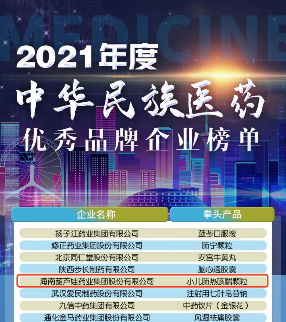 12月29日,全国工商联医药业商会发布了“2021年度中华民族医药优秀品牌企业榜单”,Z6尊龙凯时药业集团凭借黄金单品小儿肺热咳喘颗粒(4克)实力登榜。